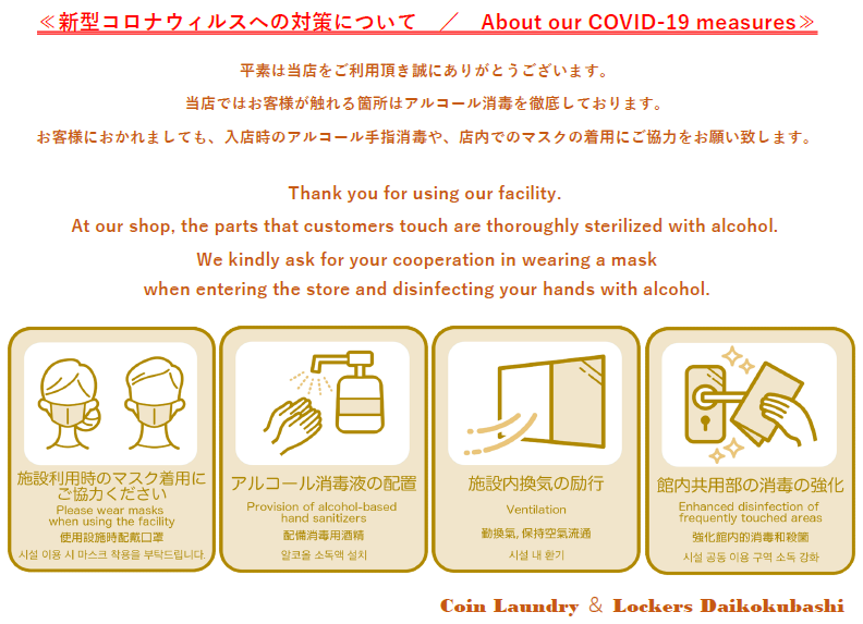 当施設では、新型コロナウィルスによる感染症に関しまして、下記のとおり館内の衛生強化及び感染予防に取り組んでおります。